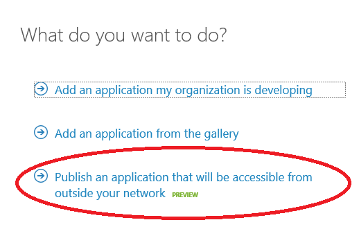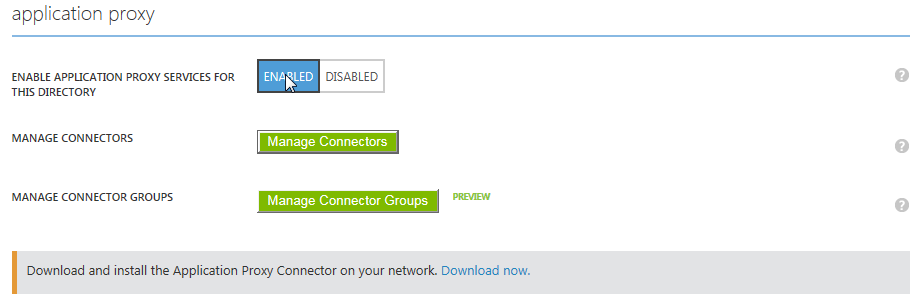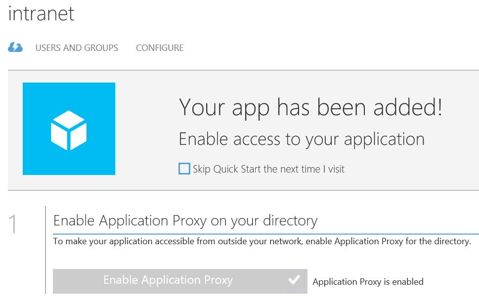 Enabling AAD App Proxy is straightforward and easy to do. Navigate to https://manage.windowsazure.com and sign-in to your tenant. Select your Active Directory tenant and configure