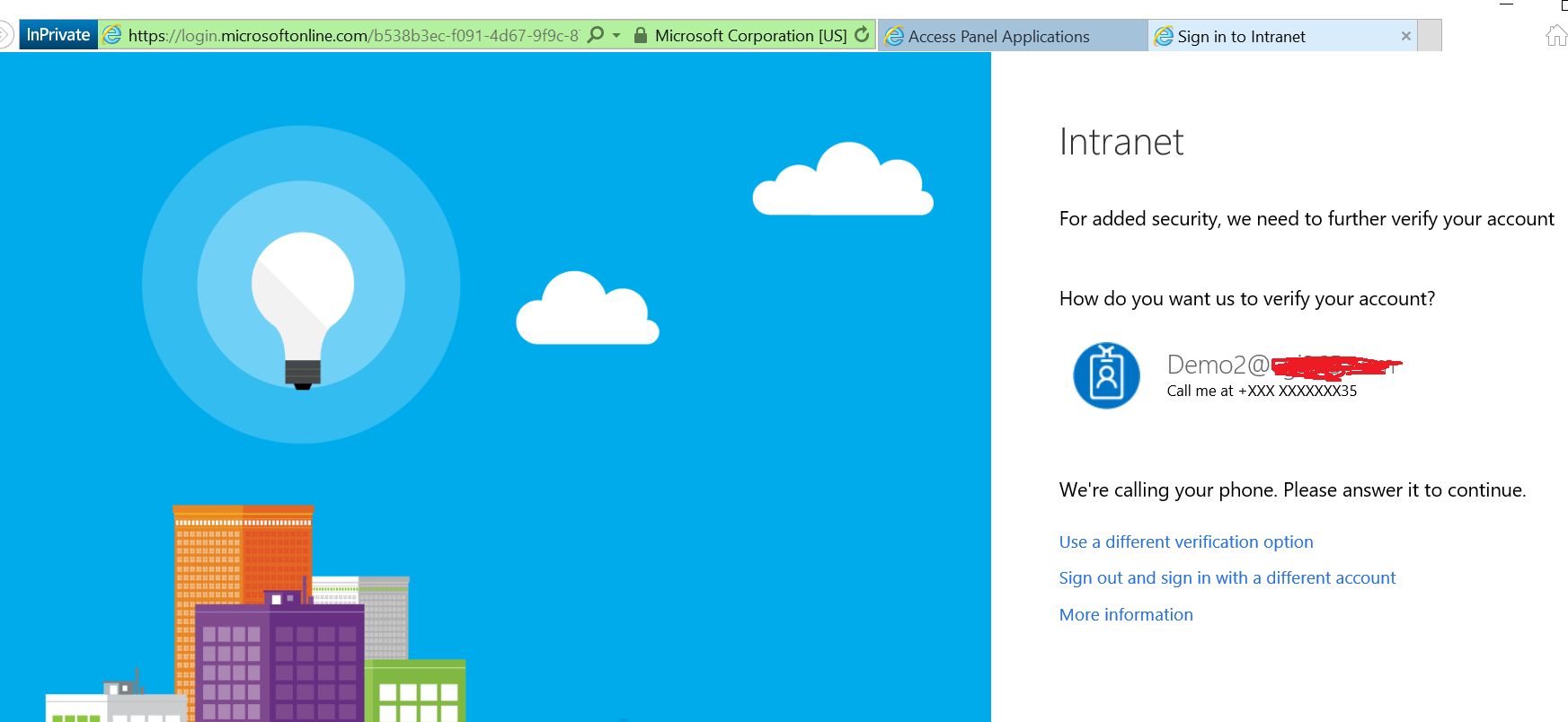When accessing the application MFA challenge is activated (mfa registration made earlier) and my demo account is receiving a phone call to verify MFA challenge.