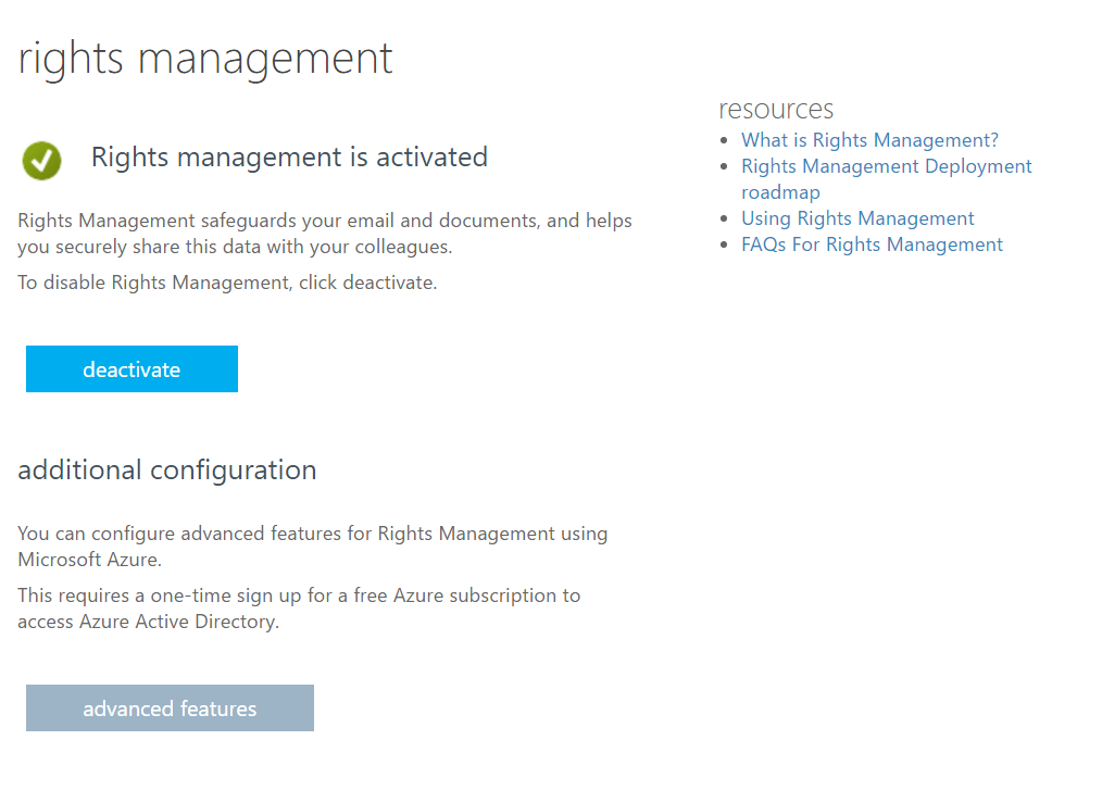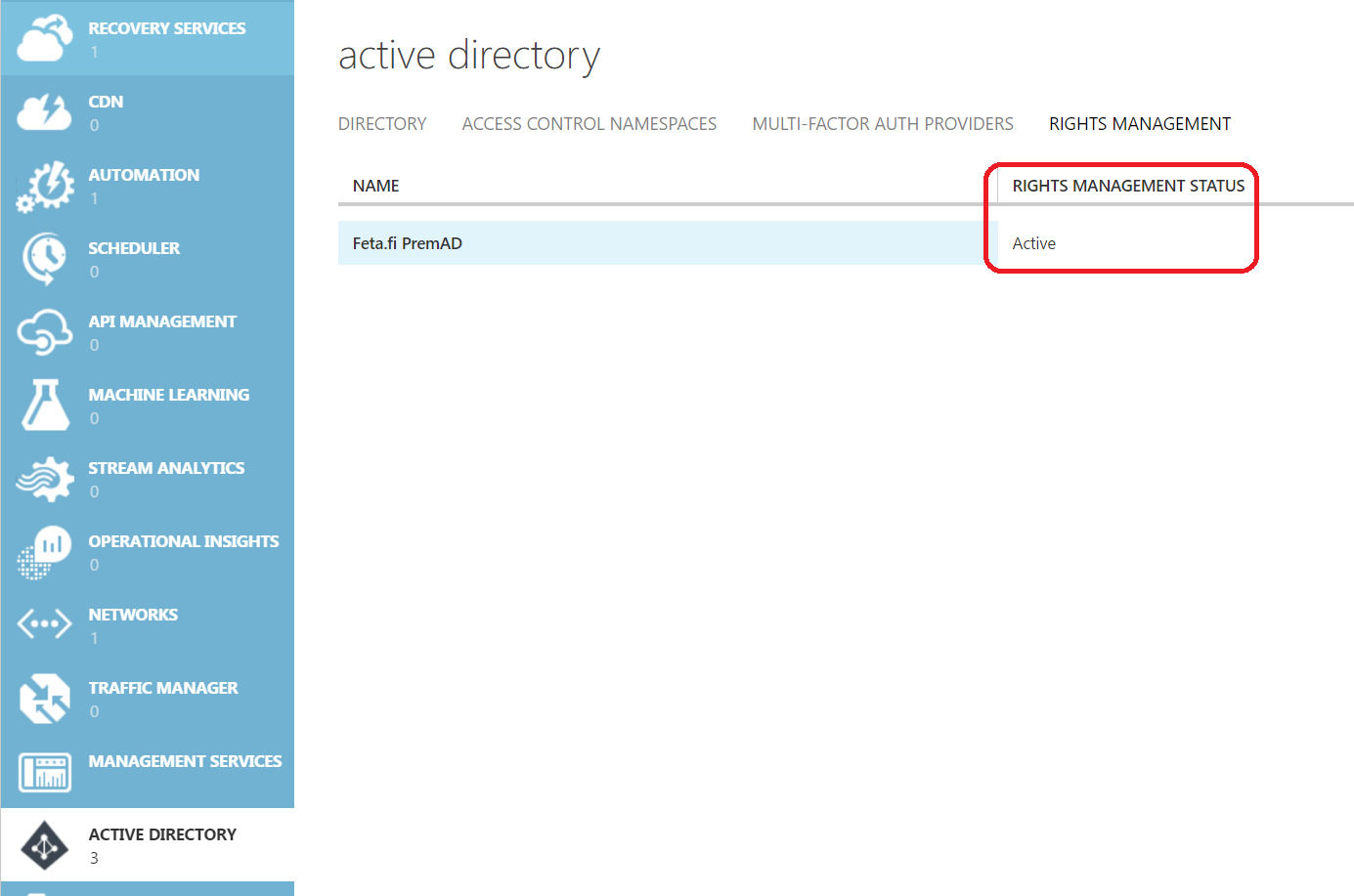 - Azure RMS activation – navigate directly to RMS activation page with account which has Global Admin permission to your tenant and activate RMS to your tenant. After activation it should look as follow from classic portal and Rights Management activation page