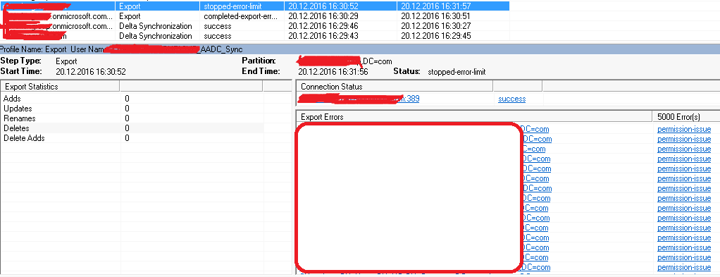 My customer has two (2) AAD Connect servers, one is as active and one is at staging mode. Exchange Hybrid configuration was performed first at staging server without any errors. Then moved to active server (which was turned at staging mode before) and performed Exchange Hybrid config with wizard. Everything went fine until export profile to on-premises AD started (when adding Exchange Hybrid to AAD Connect configuration it adds multiple attributes to mailusers depending of Exchange version) and we got 5000 errors to AADC which is the “stopped limit”.