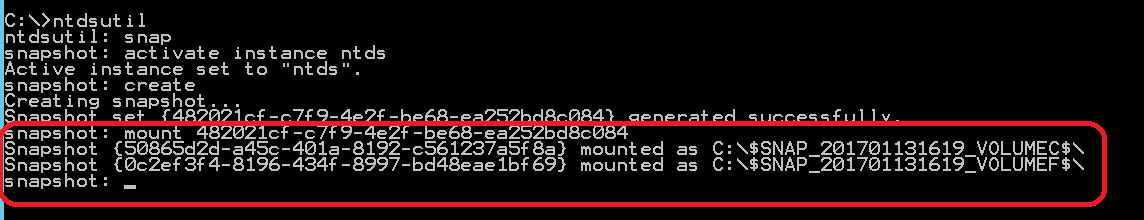- Logon to Domain Controller, open cmd.exe and open ntdsutil, activate ntds instance and create snapshot with following commands