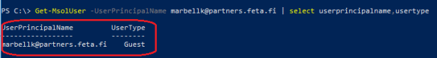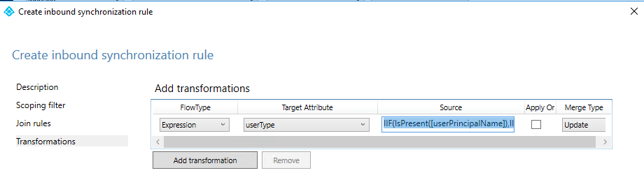 Transformation: Expression – userType – IIF(IsPresent([userPrincipalName]),IIF(CBool(InStr(LCase([userPrincipalName]),”@partners.feta.fi”)=0),”Member”,”Guest”),Error(“UserPrincipalName is not present to determine UserType”))