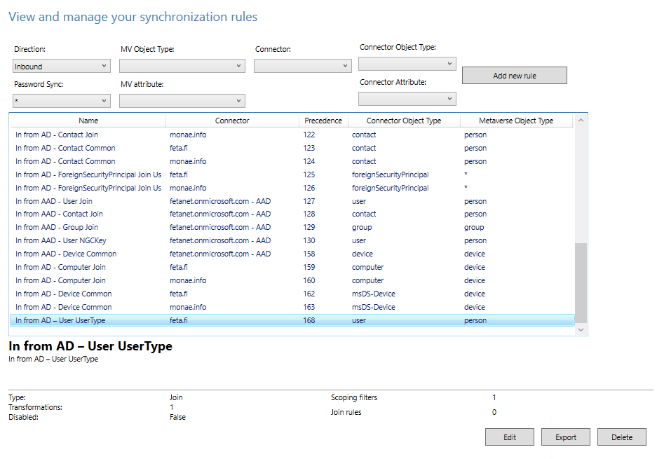 In my test environment I’m using the latter one which contains following tasks (all users with @partners.feta.fi UserPrincipalName will be synced to AAD):