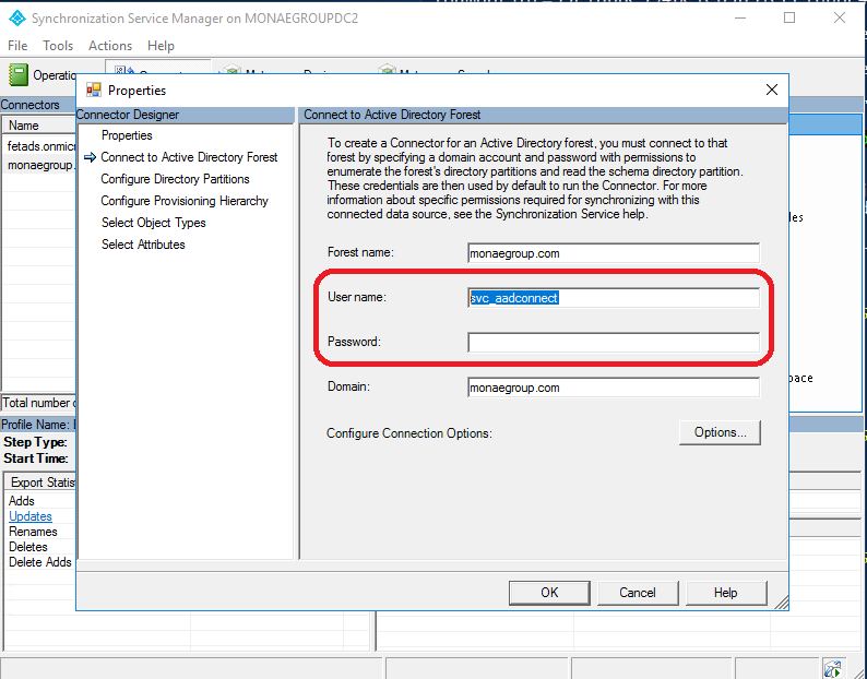 Set-ADSyncRestrictedPermissions -ADConnectorAccountDN “svc_aadconnect,OU=ADManagement,DC=monaegroup,DC=com”