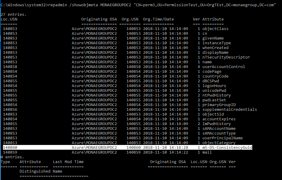 - Set-ADSyncMsDsConsistencyGuidPermissions -ADConnectorAccountDN “CN=AD_AADC_Permissions,OU=ADManagement,DC=monaegroup,DC=com” -ADobjectDN “OU=OrgTEst,DC=monaegroup,DC=com”