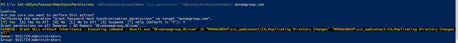 - Set-ADSyncPasswordHashSyncPermissions -ADConnectorAccountName “svc_aadconnect” -ADConnectorAccountDomain monaegroup.com