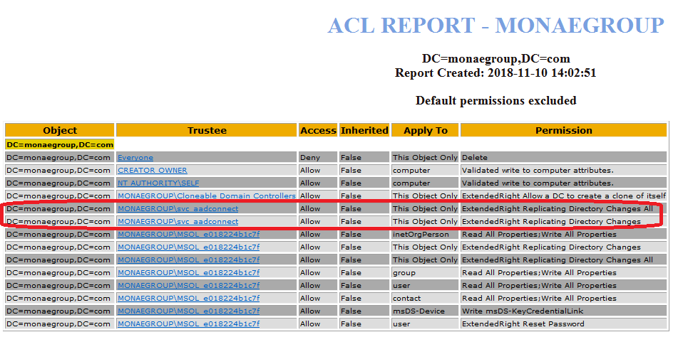 That’s right. In this blog, the permissions were defined (as an example) to a group and in one example to a svc_aadconnect account directly. I always prefer to use groups instead of users when granting permission to AD.