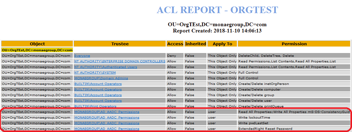 - Set-ADSyncBasicReadPermissions -ADConnectorAccountDN “CN=AD_AADC_Permissions,OU=ADManagement,DC=monaegroup,DC=com” -ADobjectDN “OU=OrgTEst,DC=monaegroup,DC=com”