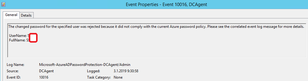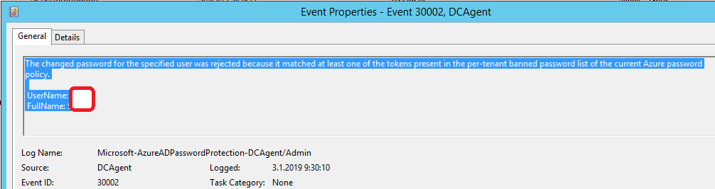 First two pictures are events from domain controller where password change request has been blocked because it was found from Microsoft global banned password list.