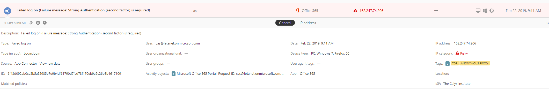 The Tor IP address 162.247.74.206 was used by CAS Demo (cas@fetanet.onmicrosoft.com).