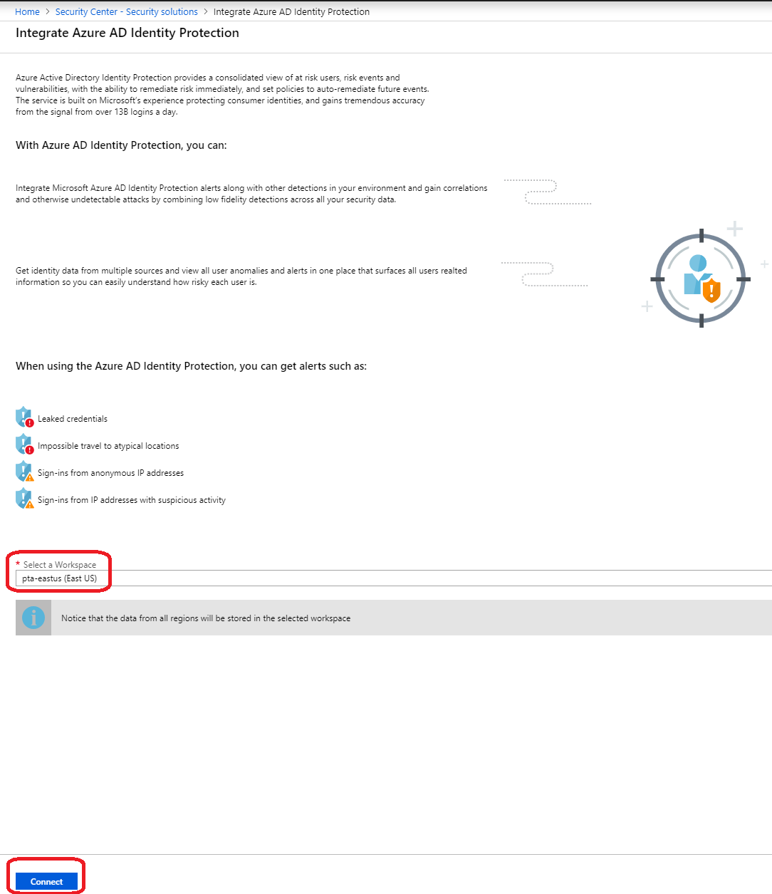 Select Log Analytics Workspace where to send events and “Connect” from bottom left corner