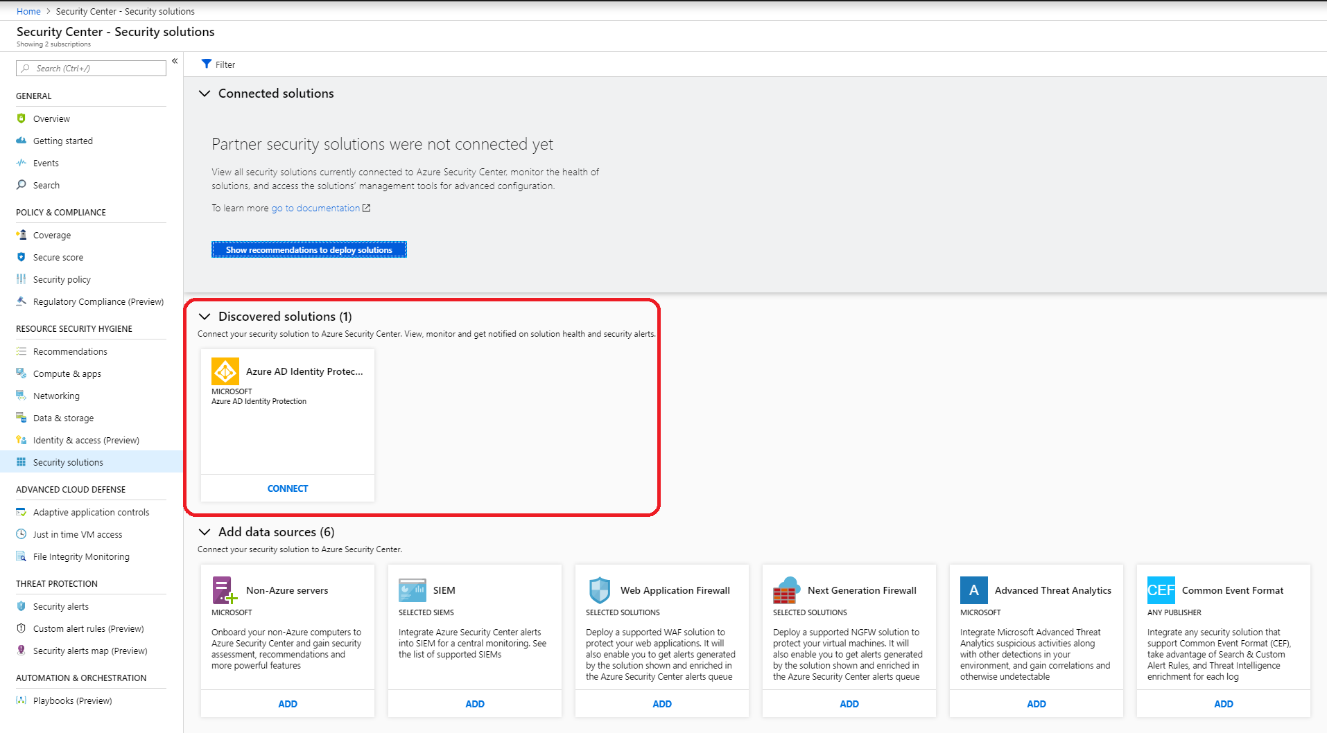 Open Azure Security Center, Security solutions and select connect