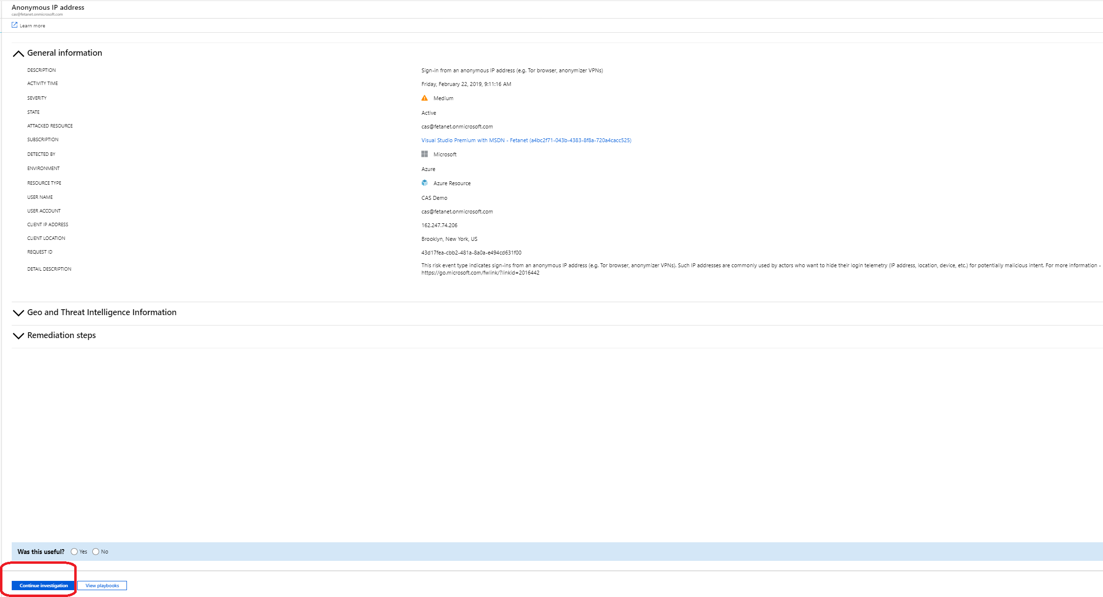 Selected the event and received basic information from the event. In cases where more investigation is needed select “Continue investigation” from the bottom left corner.