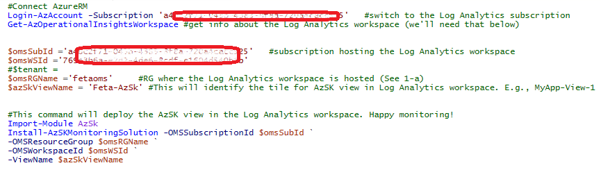 Install-AzSKMonitoringSolution -OMSSubscriptionId $omsSubId `