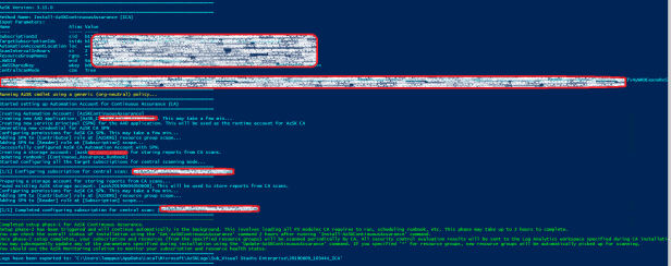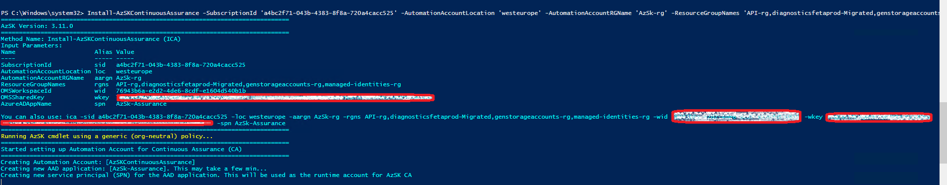 Install-AzSKContinuousAssurance -SubscriptionId 'a4bc2f71-043b-4383-8f8a-720a4cacc525' -AutomationAccountLocation 'westeurope' -AutomationAccountRGName 'AzSk-rg' -ResourceGroupNames 'API-rg,diagnosticsfetaprod-Migrated,genstorageaccounts-rg,managed-identities-rg' -OMSWorkspaceId 'Insert your LA workspace ID here' -OMSSharedKey 'insert your own LA workspace key here' -AzureADAppName 'AzSk-Assurance'