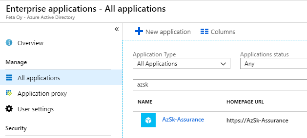 - If you didn’t create application beforehand it’s named as “AzSk-Assurance“