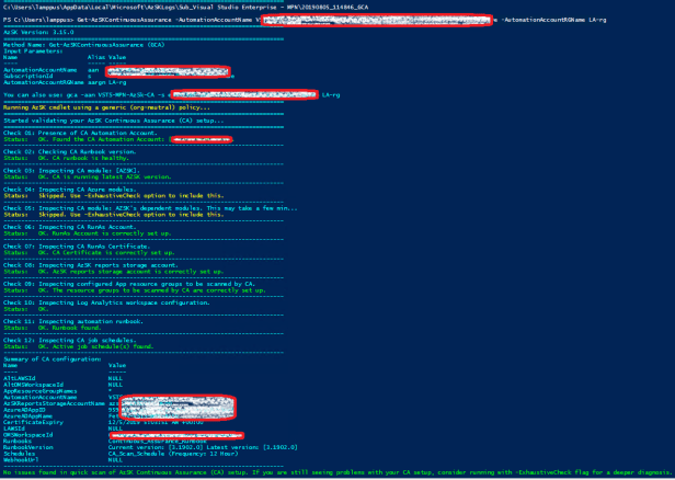 Get-AzSKContinuousAssurance -AutomationAccountName <Account Name> -SubscriptionId <Sub ID> -AutomationAccountRGName >Resource Group Name>