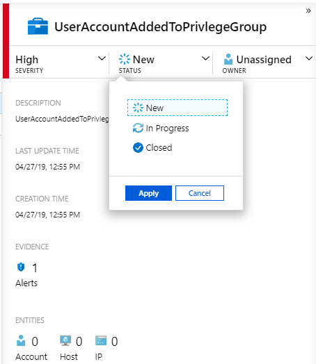 When user is added to high privileged group in on-premises Active Directory and Log Analytics Agent has send data to the workspace the case will be created to Sentinel dashboard. Following actions are available for investigation: