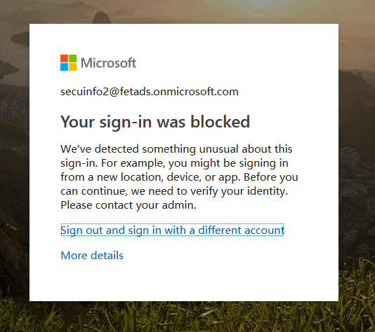 Again, opened my favorite browser for testing purpses (Tor) and navigate to aka.ms/mfasetup. As you can see, sign-in was blocked