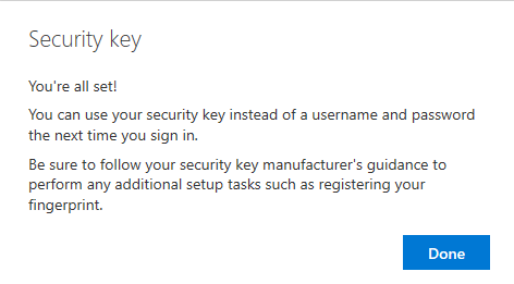 When the key has been added successfully, it can be used to sign-in from the W10 lock screen or via supported web browsers.