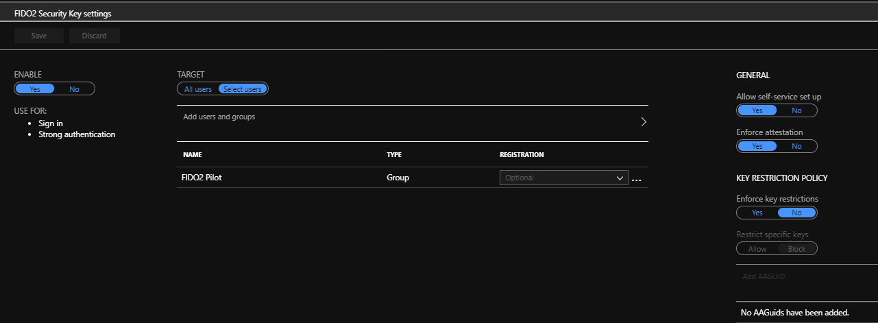To enabled FIDO2 security keys to your tenant navigate to aad.portal.com and “Authentication methods” blade. From there select FIDO2 security key and you can configure needed settings.