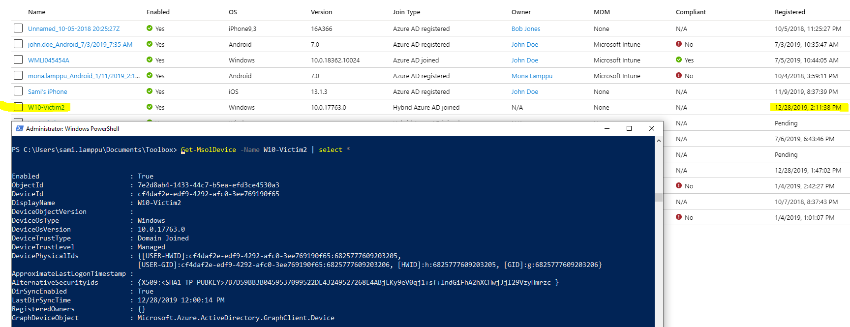 - AlternativeSecurityIds contains the certificate thumbprint with a specific scheme format (i.e. “X509:<SHA1-TP-PUBKEY>:” + thumbprint). This is how Azure AD will find the device object when the device presents the certificate upon authentication.