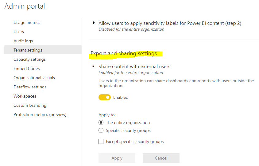 If you want to block external sharing totally from Power BI, it’s possible from Power BI tenant wide settings.