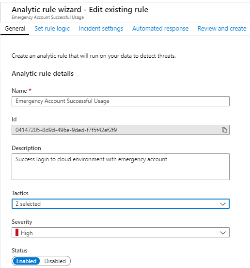 You can see that there are a different colors in front of the rule. Red means “High” and Orange means “Medium”. Naturally, playbooks could be integrated for the rules to mitigate possible breach. Extra caution is needed with automation because there might be situation where automatic mitigation should not occur if immediate access with the account is needed.