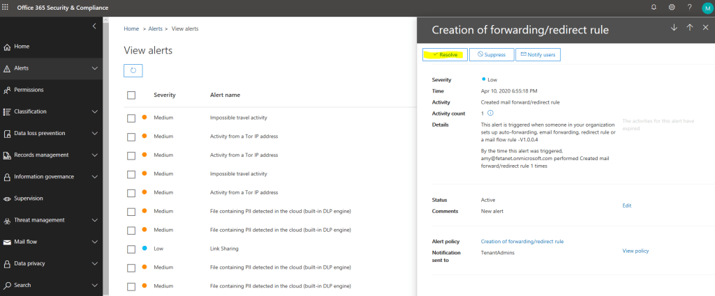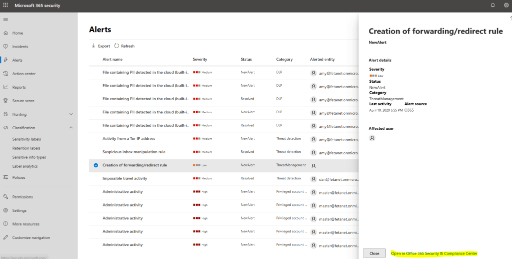 Here is a slight difference to earlier examples (to incident management), the alerts cannot be modified in the MTP portal. On the alert page, there is a link to the O365 Security & Compliance portal where alert needs to be managed.