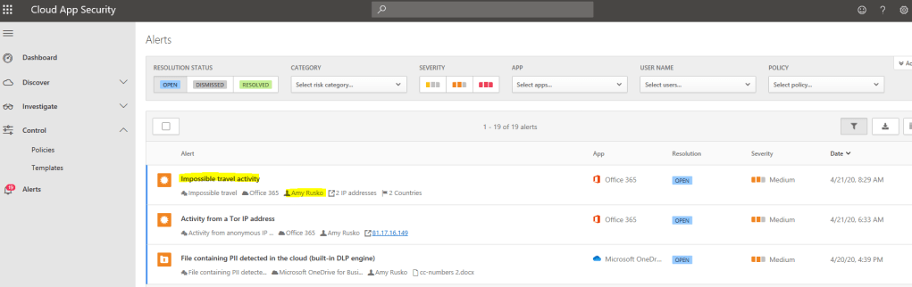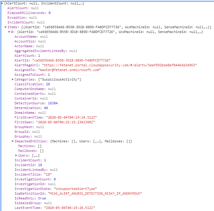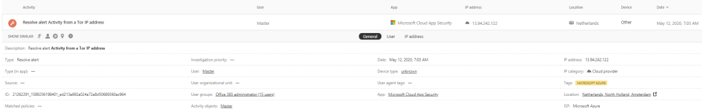 In the second example, we have the MCAS incident in MTP which contains Cloud App Security alerts (MCAS doesn’t have incidents) in Microsoft Threat Protection (security.microsoft.com) portal.