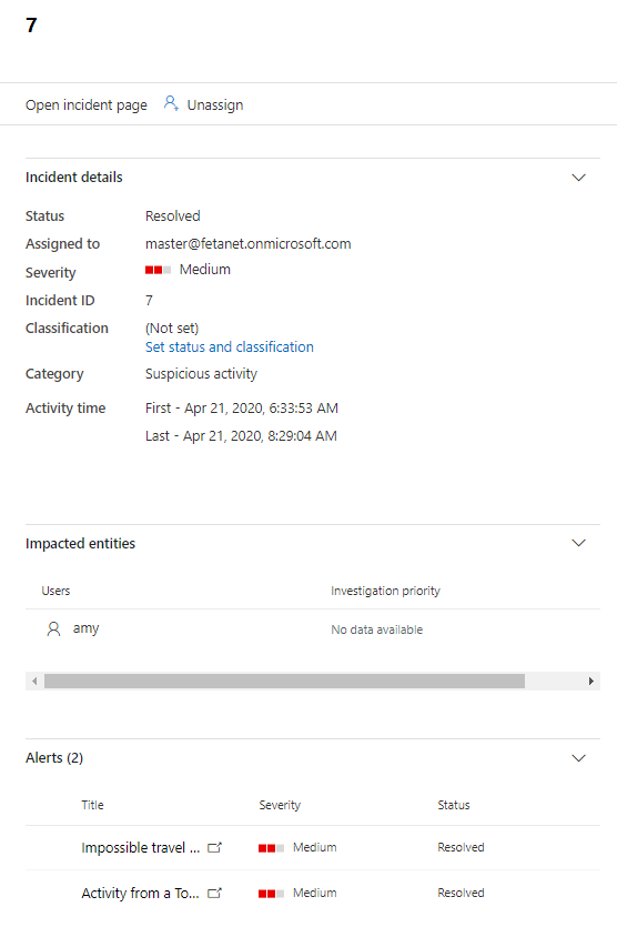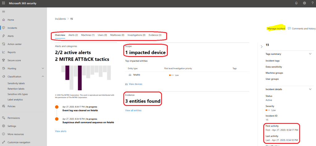 When you click “manage incident” you land to the Incident page where you can find all the necessary information related to the incident. As you can see, the activity times are identical in both Security Centers.