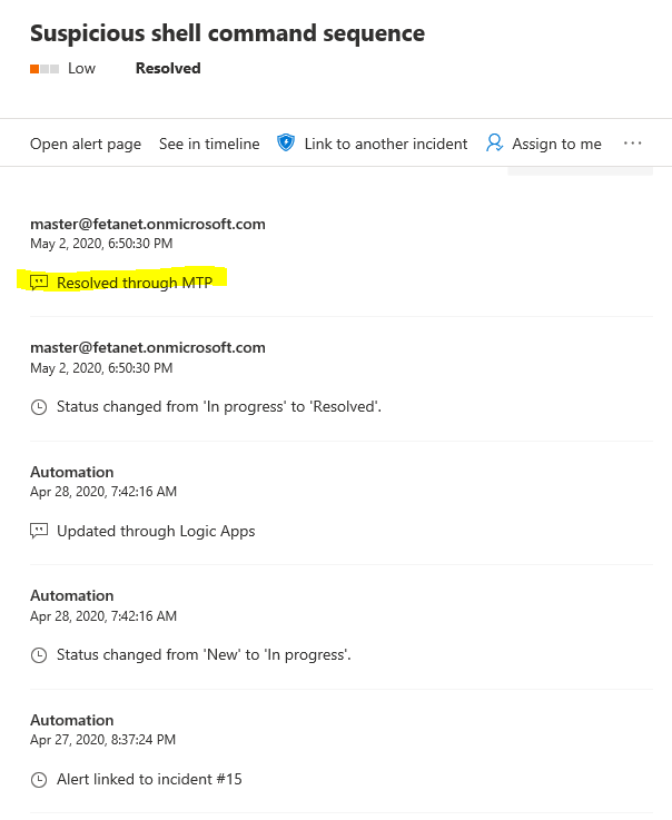 When you resolve the alert from O365 Security & Compliance Center, the alert status will be synced to MTP. Again, this a brilliant feature which I have been missing a lot.