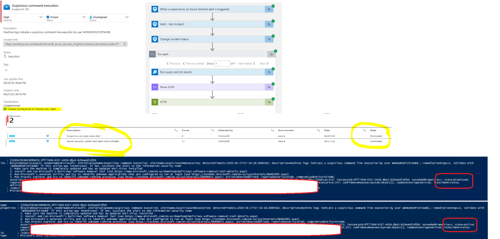• Azure Sentinel Playbook (Logic Apps) is used to close incident from Sentinel and Azure Security Center