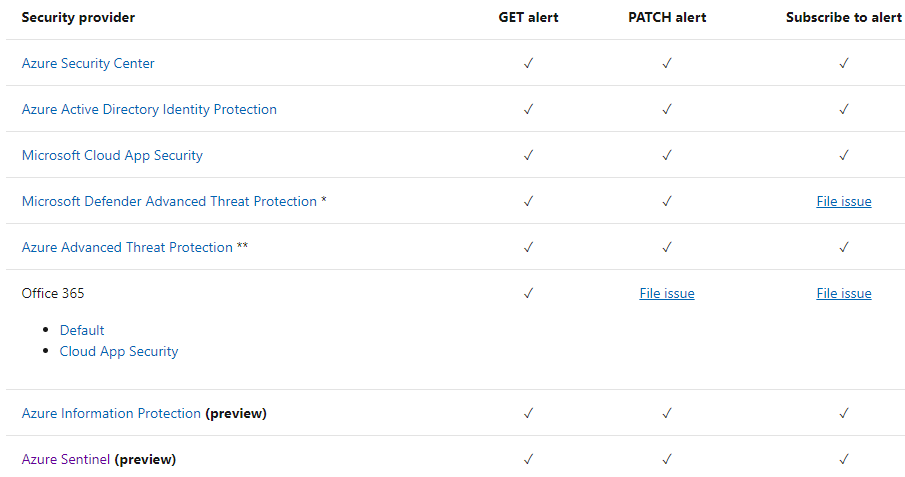 Support for GET alerts, PATCH alerts (updates are available via the Microsoft Graph Security API but might not be exposed in the provider’s management experience).