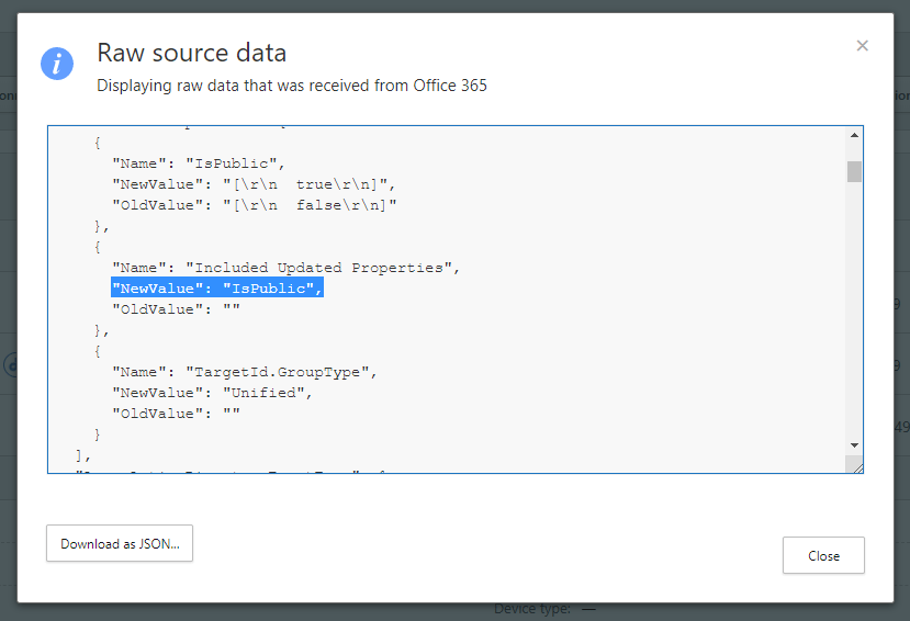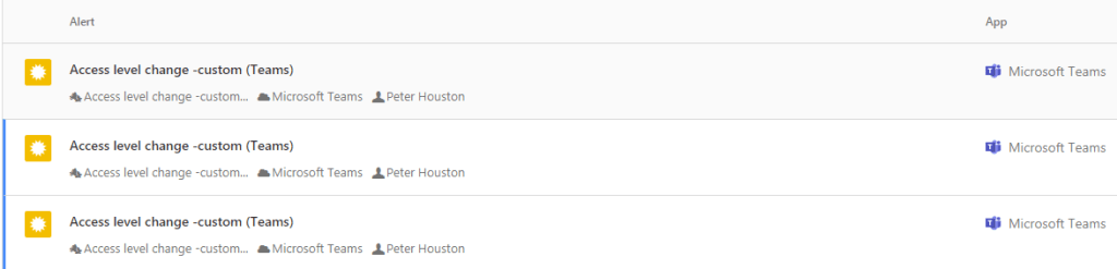 As you can see, there are multiple alerts from access level change and in raw data, we can see that the Teams access level was turned in “public” mode.