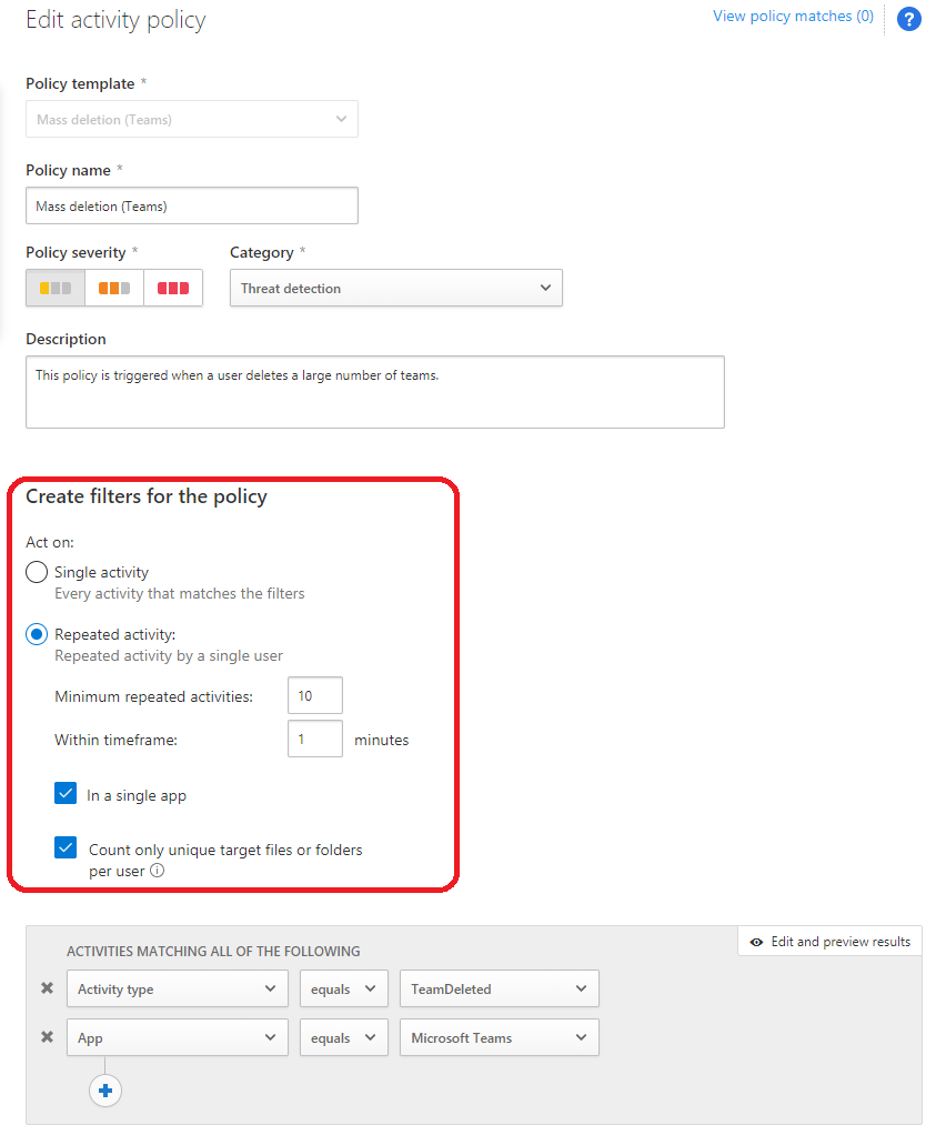 This policy triggers an alert when an activity is “TeamDeleted” and thresholds defined in the policy are reached. For testing purposes, I defined minimum repeated activity from 10 to 2.