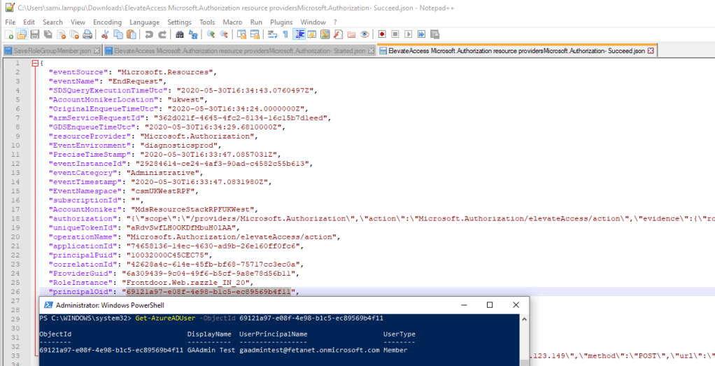 When you receive the data, the next question is, does it contain any information about the elevated access? Yes, it does! I can see that there are two events: