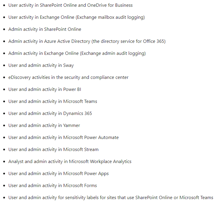 From the pictures below, you can find a list of the services and audited activities in terms of auditing. More information from the “O365 Unified Audit Log” reference doc.