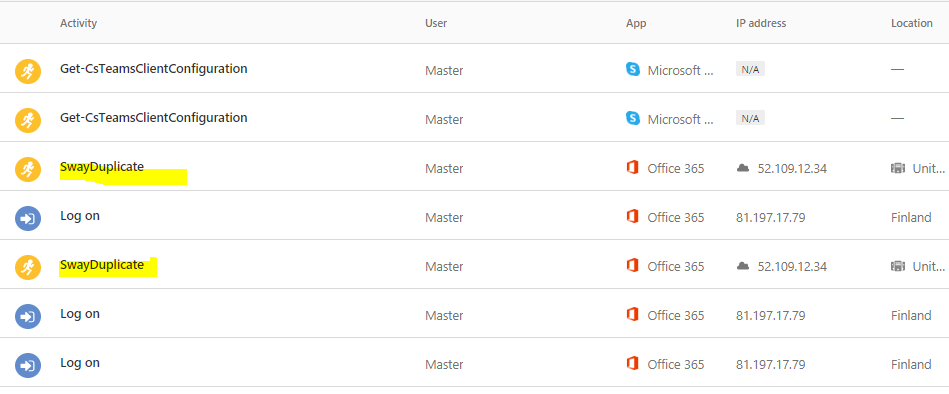 Even though the activities should ‘flow’ to both Unified Audit Log (UAL) and Cloud App Security, I have found that in some cases (example with Sway) the MCAS activity log doesn’t contain the same activities as UAL (see pics below). Sway events should be found from the logs inside the 24h timeframe but I have a slightly different experience.