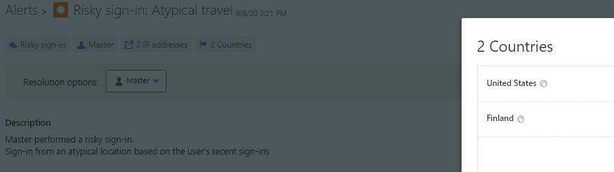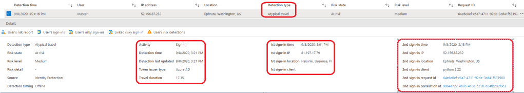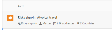 Even though the “Atypical travel” detection is offline it was pretty fast, 3min after the second sign-in from Ephrata, Washington. Have to say that I’m impressed. But as said, enough sign-in data is needed this one to succeed.