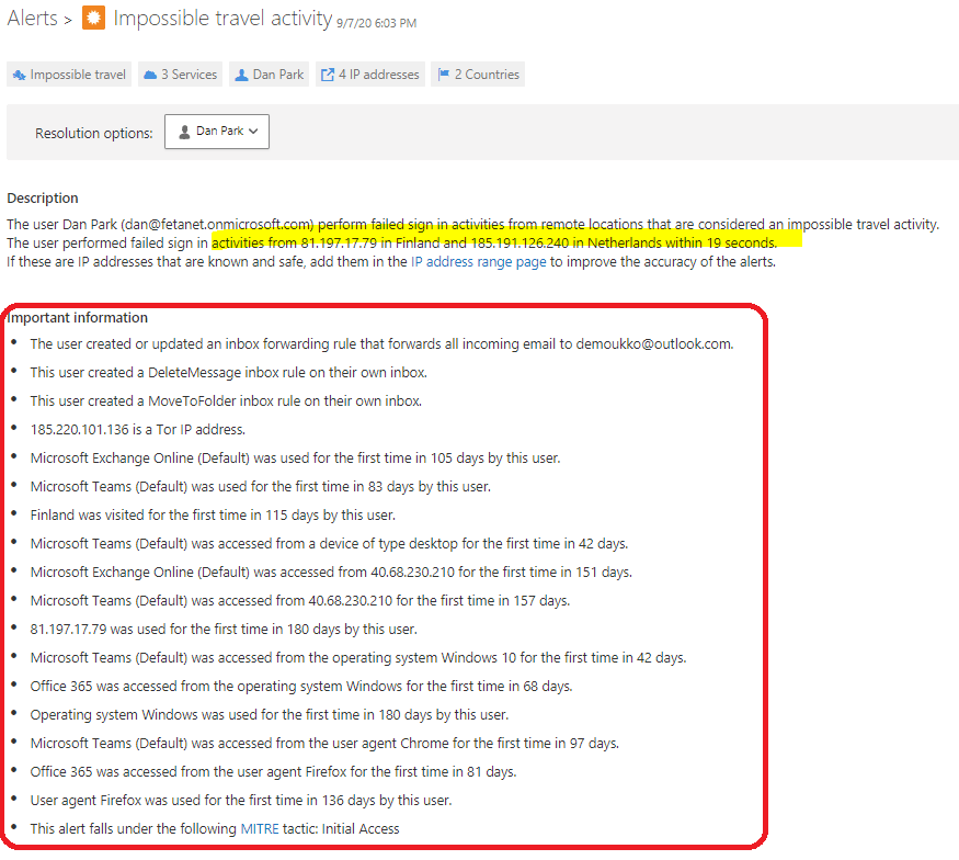 The imaginary malicious actor used the admin account for login in my environment. This user has a lot of sign-in data collected during past years and for that reason alert is triggered immediately when location changes.