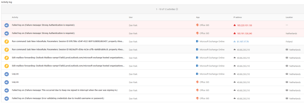 As you can see from the pictures below there are many activities related to this alert. MCAS correlates the data and adds important information from the user activities to the alert itself such as: