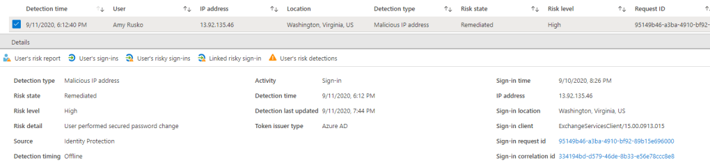 Sign-in from a malicious IP was logged 9/10/2020, 8:26PM, and the IPC detection 9/11/2020, 6:12PM. In this case, the detection and alert were mitigated because the user performed password change.