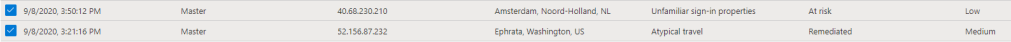 In Identity Protection we can see user risks, “Atypical travel” and “Unfamiliar sign-in properties”. The first one raised a risk level to medium but was remediated because of IPC policy enforced password change. The latter one is categorized as low-level risk and doesn’t affect to the user authentication process, for now.