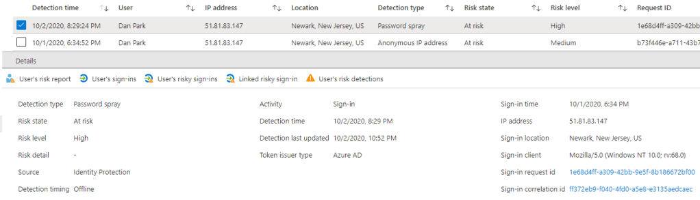 To the best of my knowledge, the “Password Spray” detection is not rolled out to every Azure AD tenant Identity Protection instance. My demo tenant might be in the first ring (located in the US) because 10/5/2020 received a detection to Identity Protection. As you can see, the user risk is “High” because of a successful login attempt after a series of failed ones.