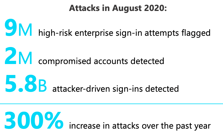 Nowadays, the protection of identities is an essential part of the security architecture and strategy today. At the times we are living now, the COVID-19 pandemic has changed IT-environments drastically compared to the past. Microsoft statistics show clearly that attack against the cloud environment has increased a lot in COVID-19 times. Some insights were shared during Ignite 2020 by Microsoft.