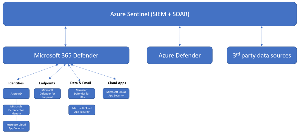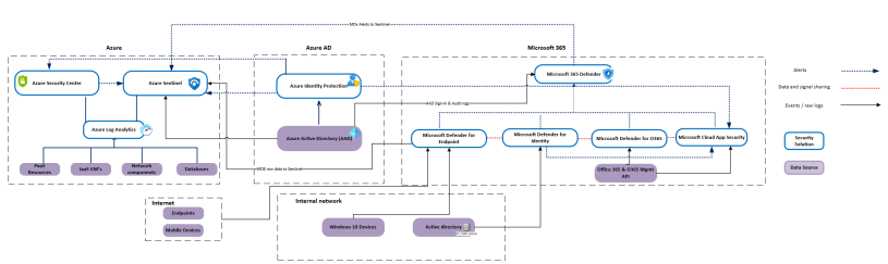 In the picture, the assumption is that from Azure, Azure AD, and Microsoft 365 the main security solutions are used, such as Azure Sentinel, Azure Security Center & Microsoft 365 Defender solutions.