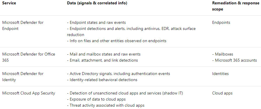 From docs.microsoft.com – The table below lists how each supported M365 Defender service provides additional data, opportunities to obtain additional insight by correlating the data, and better remediation and response capabilities.