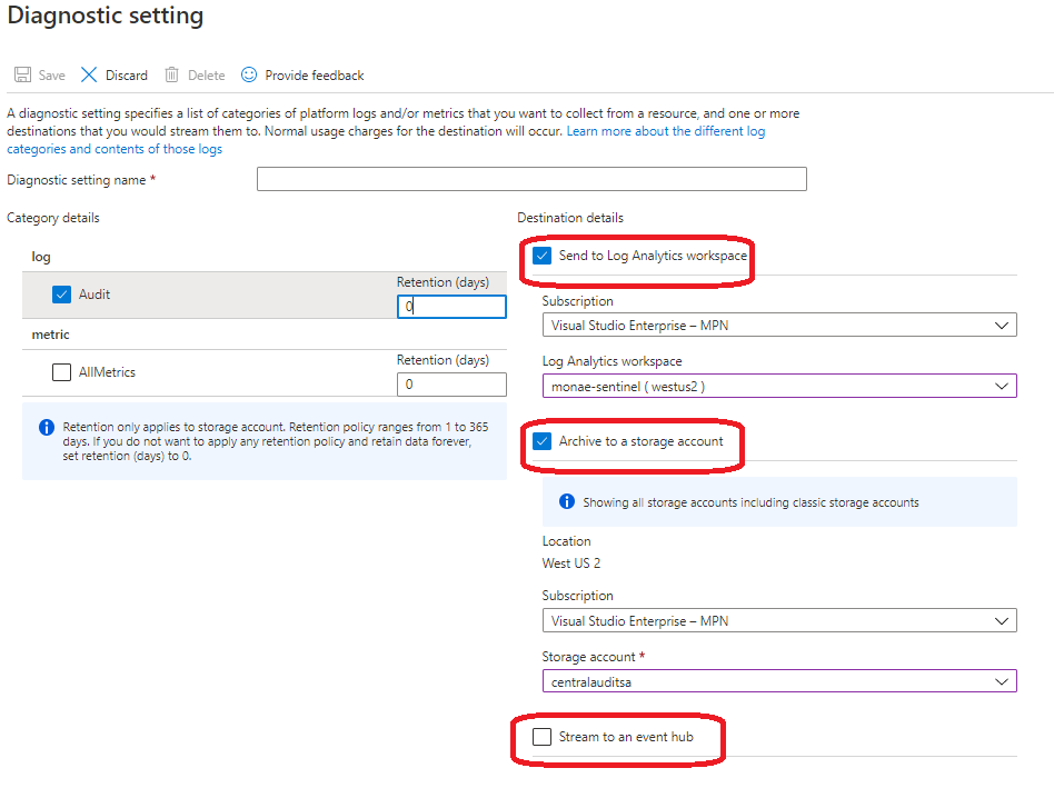 - Might be beneficial to send audit data to a dedicated subscription where a separate LA workspace is located