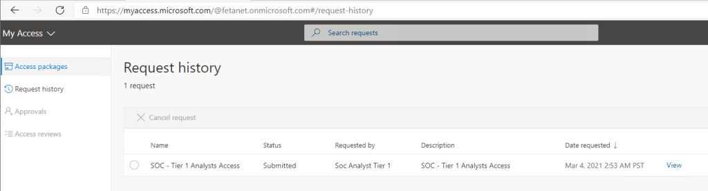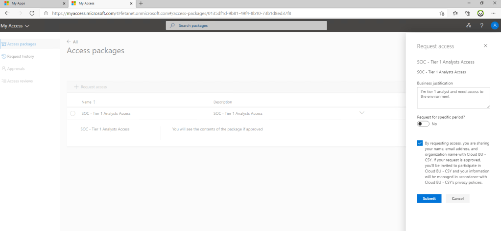 When everything has been set up you can provide a link to MSP to both access packages. MSPs analysts can then request access to the resources defined in the access packages. If approval is configured in the flow the approver needs naturally approve the requests before those are active.